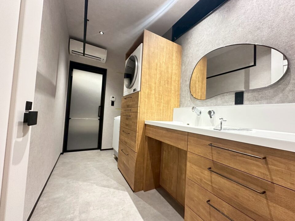 ・乾太くんやエアコンがある洗面脱衣室。 室内干しがしっかりとできる広さです!!